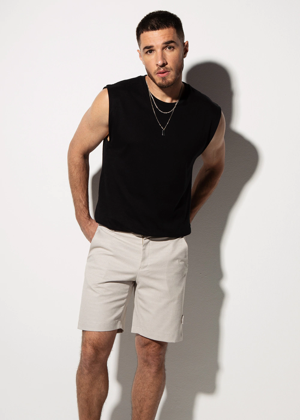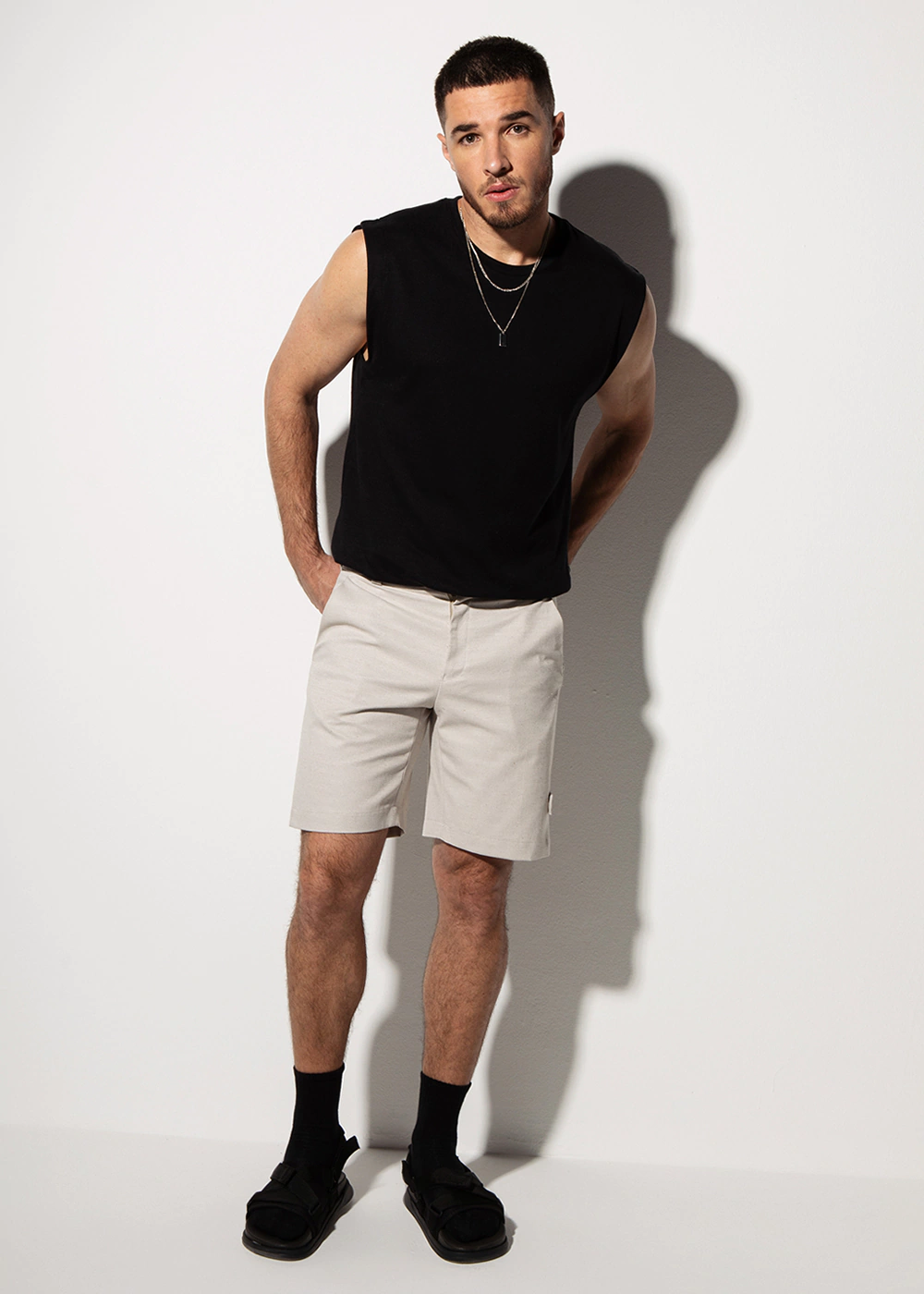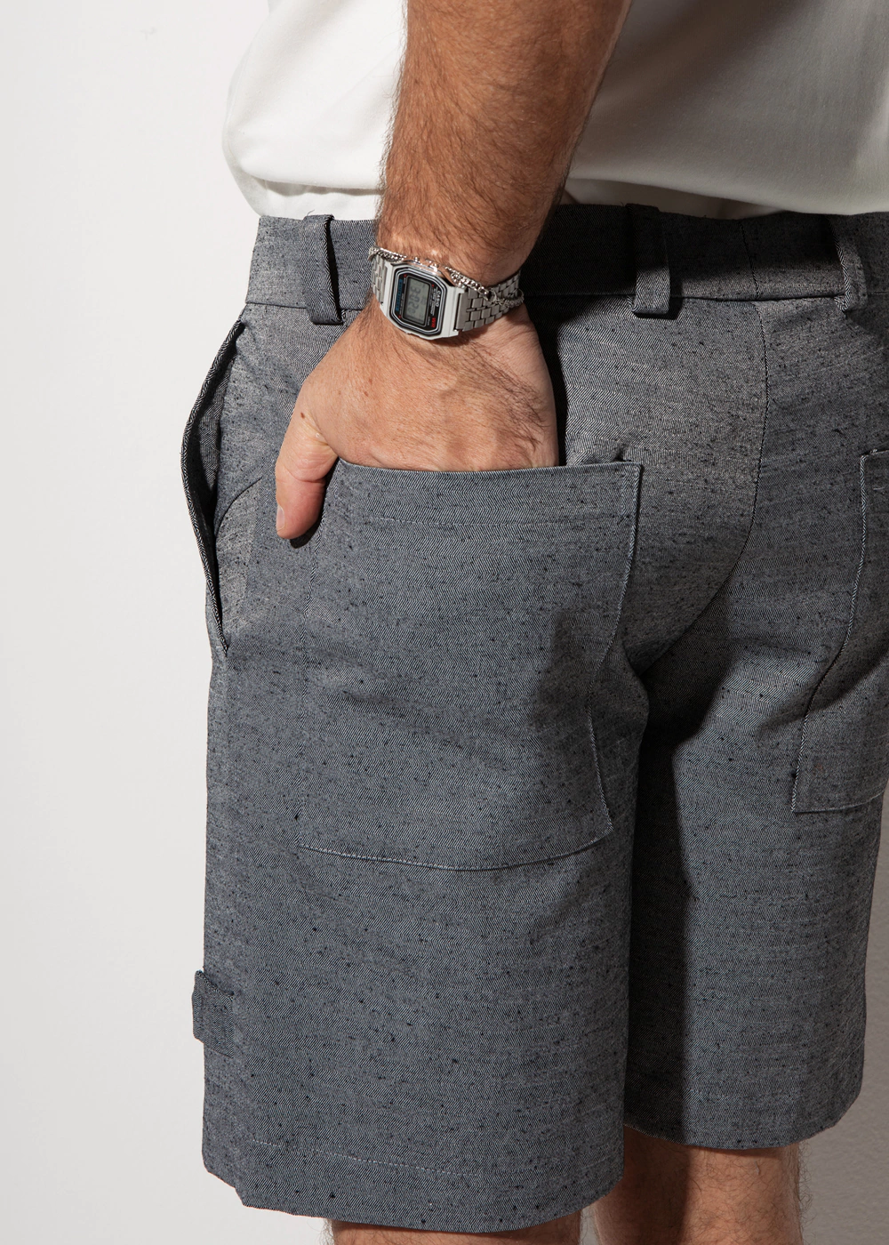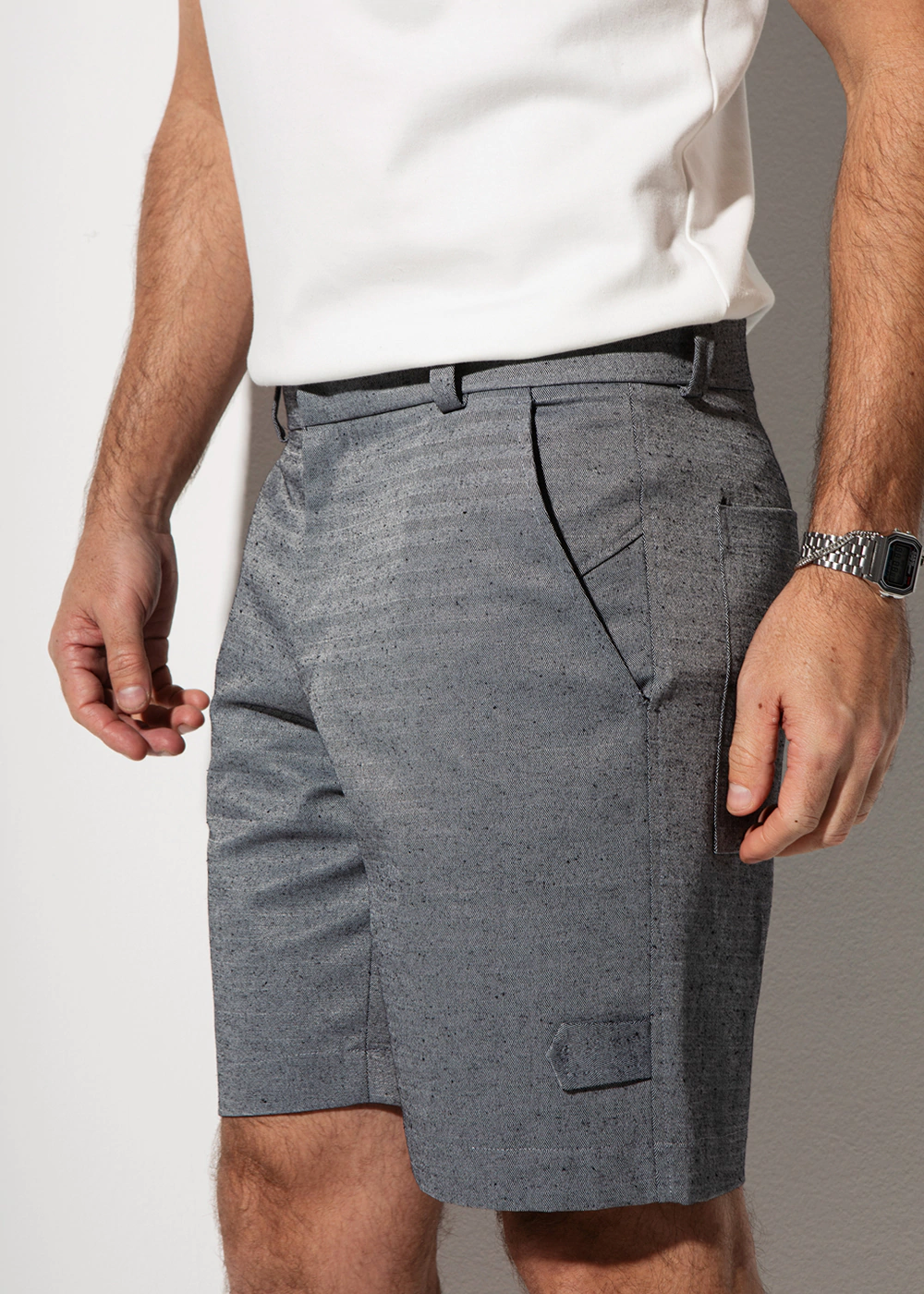 Bermuda de alfaiataria em tecido de algodão e poliéster com efeito chevron, garantindo um visual moderno e sofisticado. O design inclui cós estático com passantes para cinto e bolsos com recorte diferenciado que adicionam estilo único à peça.