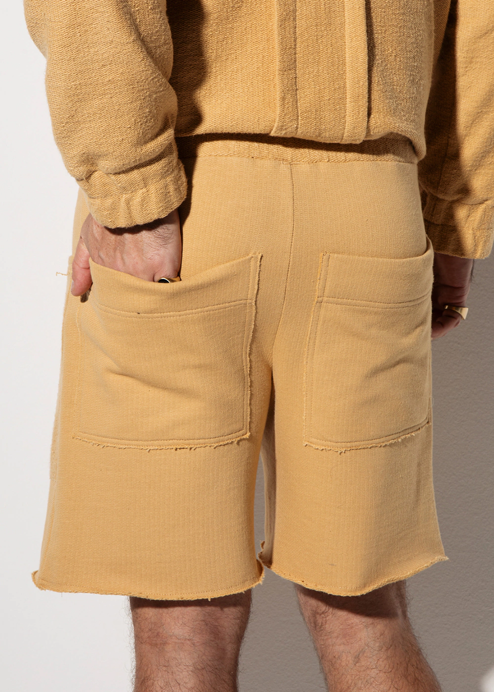 Bermuda com acabamento rústico e design que valoriza o contraste entre o avesso e o direito do tecido, criando texturas modernas e exclusivas. O cós com elástico e cordão proporciona conforto e ajuste perfeito.