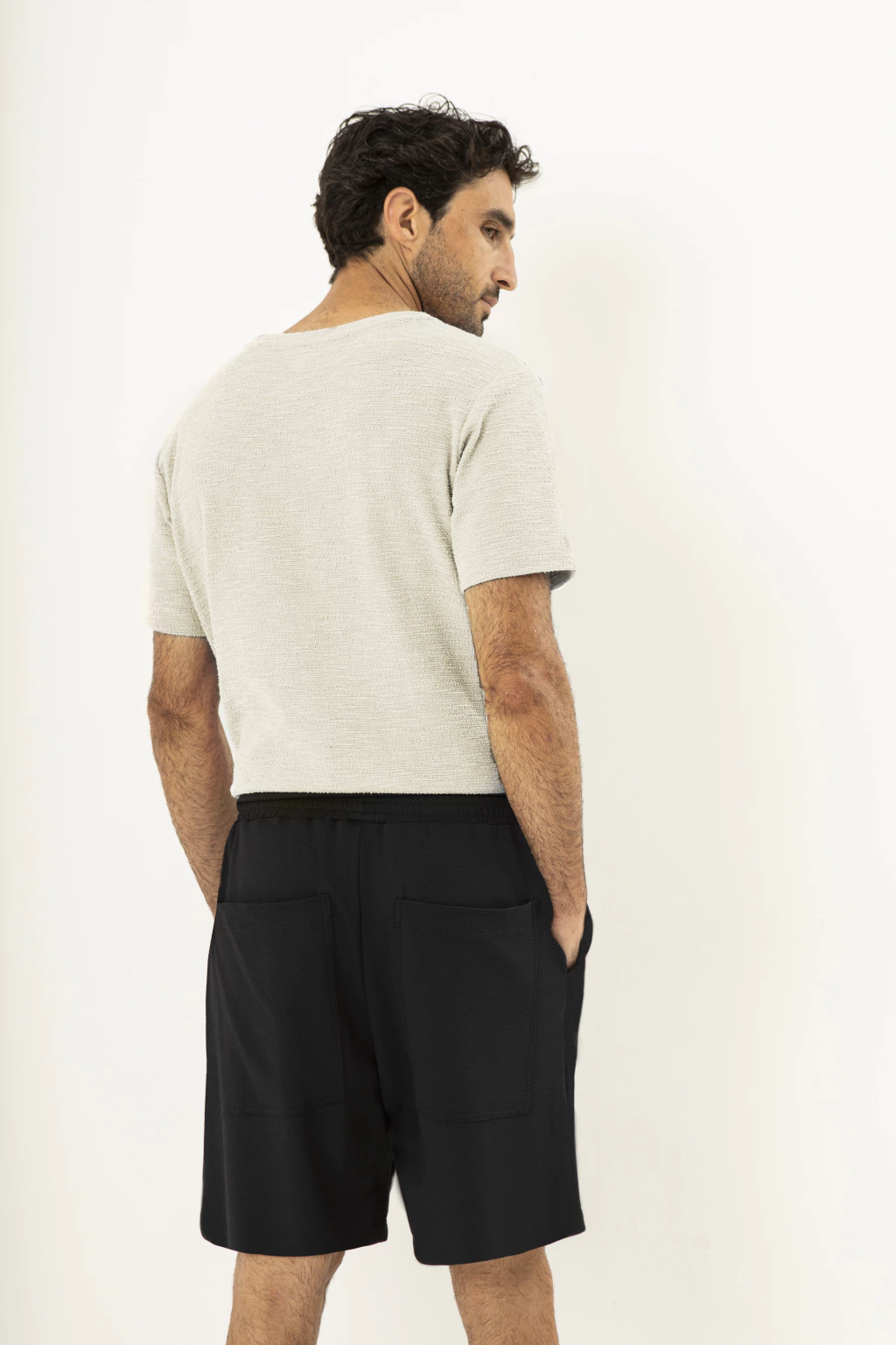 A peça que encontra o melhor dos dois mundos: visual limpo de alfaiataria com conforto de tecido tecnológico. A bermuda urban tech tem corpo reto, malha texturizada e estrutura encorpada, que valoriza o caimento e evita transparência. Cintura elástica com cordão náutico bicolor, que garante o conforto. Quatro bolsos: dois frontais aplicados e dois traseiros tipo patch para praticidade sem volume.